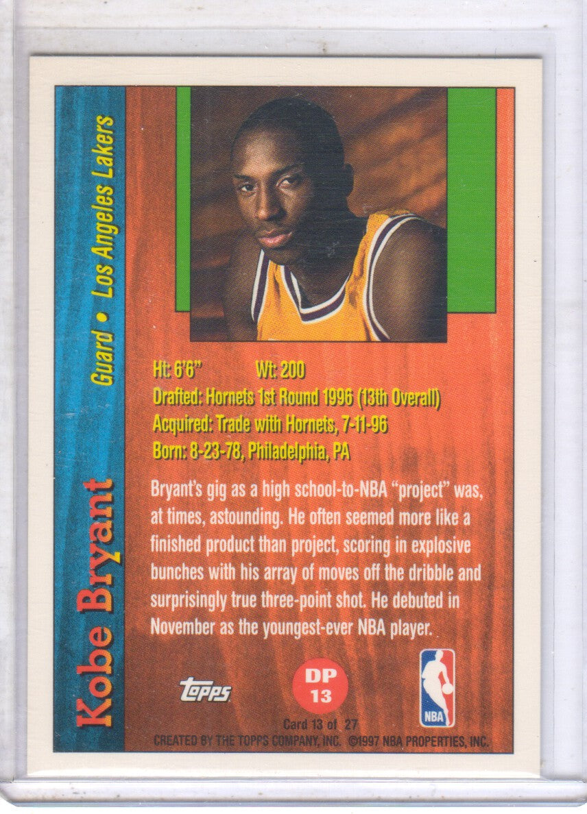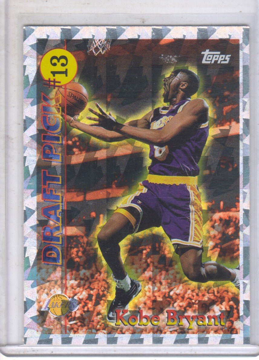 This is a raw 1996 Topps Kobe Bryant rookie card, part of the Draft Pick subset. The card features an iconic image of Bryant in his Los Angeles Lakers uniform, showcasing his athleticism and potential as one of the NBA's most promising young stars. The front of the card prominently displays 'Draft Pick #13' with a vibrant background design that captures the excitement of his entry into professional basketball. The back provides biographical details about Bryant, including his draft history as the 13th overall pick by the Charlotte Hornets before being traded to the Lakers, and highlights his transition from high school to becoming the youngest-ever NBA player. The card has been well-preserved with sharp edges, clean surfaces, and vivid colors, earning it a near-mint classification.