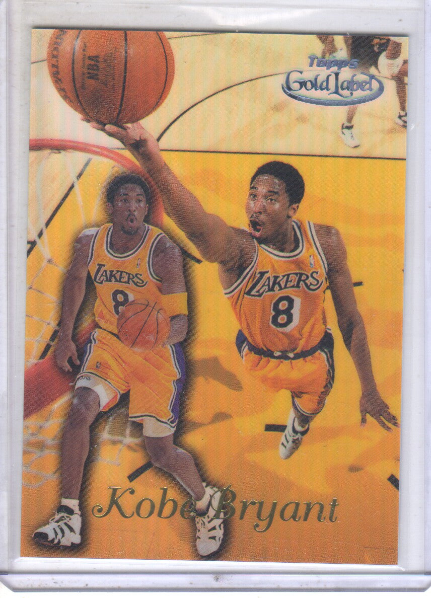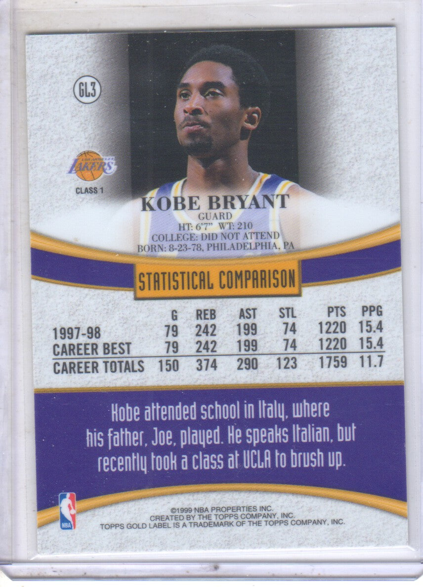 This is a raw 1999 Topps Gold Label Class 1 basketball card featuring Los Angeles Lakers legend Kobe Bryant. The front of the card showcases a dynamic image of Bryant in action, wearing his iconic #8 jersey, with an artistic dual-image design that captures his athleticism and dominance on the court. The back of the card provides biographical information, including his height, weight, birthplace, and a brief note about his international upbringing and connection to Italy. It also highlights key career statistics from the 1997-98 season, where he averaged 15.4 points per game. The card is in near-mint condition, with clean edges, sharp corners, and vibrant colors, making it a desirable piece for collectors and fans of one of basketball's all-time greats.